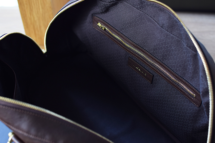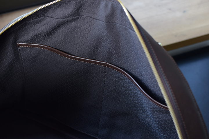 背胴側には、WILDSWANSのゴールドカラーの箔押しロゴが光ります。そして、こちらには、ファスナー開閉式のインナーポケットを備えています。(背胴側のインナーポケット収納部:H16×W25㎝)