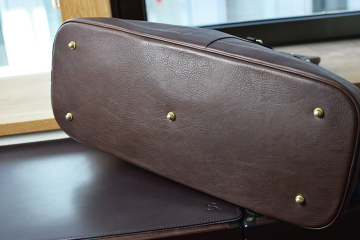 底面には大きな芯材を仕込んでいるので、安定してものを収納できる他、使用していく過程で生じる本体底面のゆがみを軽減してくれます。また、バッグを置いた際に、直接底の革が地面に触れないように5点の底鋲を配置しています。