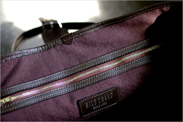 鞄の内側は6角形柄のオリジナルコットンを使用しています。ポケットは鞄の背面側にファスナーポケットが1つと、大変シンプルな作りです。(ファスナーはエクセラファスナーの3番を使用しています。)