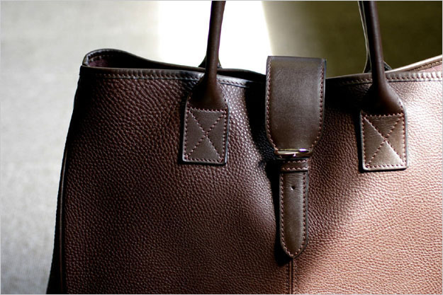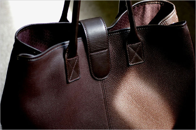 ↓ 鞄の背面はこんな感じです。口部分中央のフラップとハンドルはヘビーレタンという曲げ伸ばしに強いスムースの革を使用しています。ヘビーレタンのハンドルは手の平にしっくりと馴染む、握り心地の良いハンドルです。