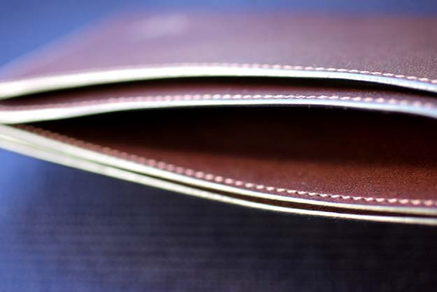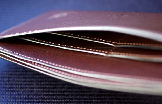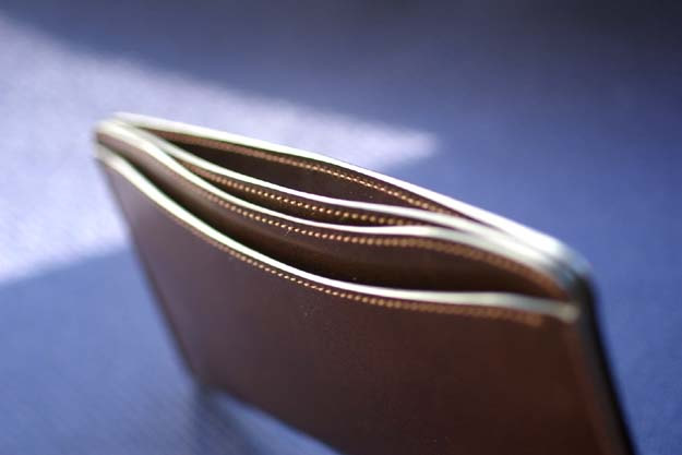 この札入れはボリュームを落とす為にマチを設けませんでしたが、部屋は3室構造になっていて、実は見た目以上の容量があります。(容量については次回、触れたいと思います。)