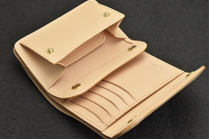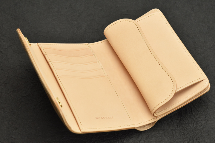 外装はポケットやホックなどのないプレーンな一枚革です。 始めは皮革のハリが強く開いたままですが、ご使用頂いていれば徐々にしなやかになって自然と閉じるようになります。