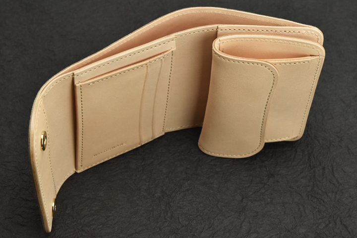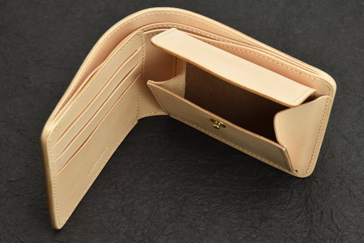 内装の右側にはコインケースが付属します。 コインケースはフラップ式で中央のホック1点によって留められています。