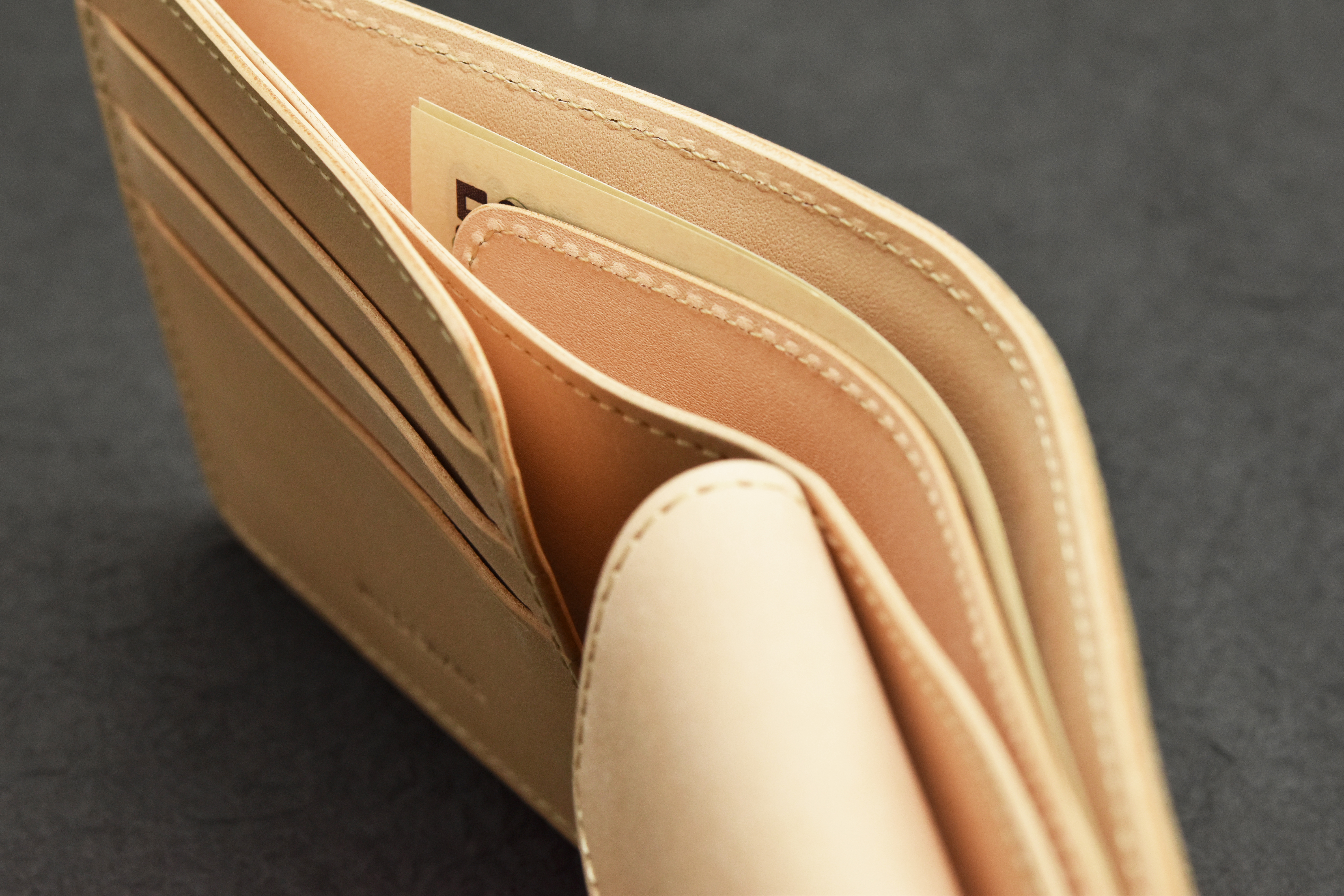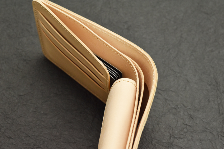 カード段の裏側には左側面と底辺のみ縫製され、L字に開いたポケットが配置されています。あおりポケットと呼ばれるこのポケットには、数枚のカードを束にして差し込んで収納することが出来ます。