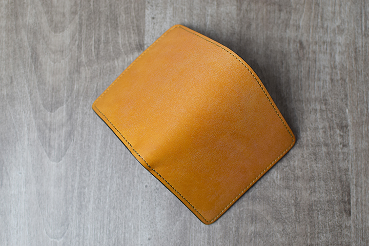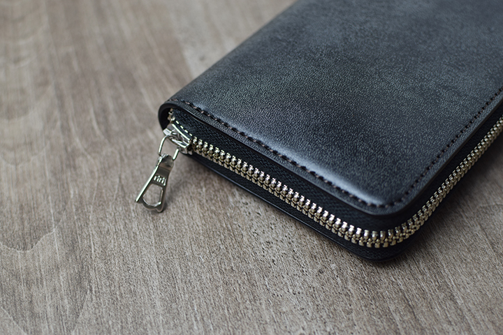 まずはこのどっしりとした風貌をご覧ください。外装は、切れ目のないフルグレインブライドルレザーの大きな一枚革です。外装にポケット等のパーツがない分、フルグレインブライドルレザーの迫力を存分に味わうことができます。kf-001は製品仕様上、コバ磨き器具のスリッカーは付属していませんが、ファスナーパーツと平行して2本のコバが美しいラインを描きます。もちろんこちらのコバも他のWILDSWANSと同様に職人が丹精を込めて磨き上げています。