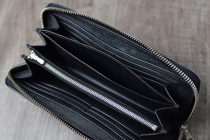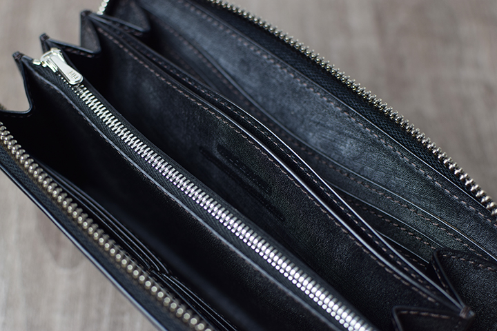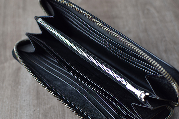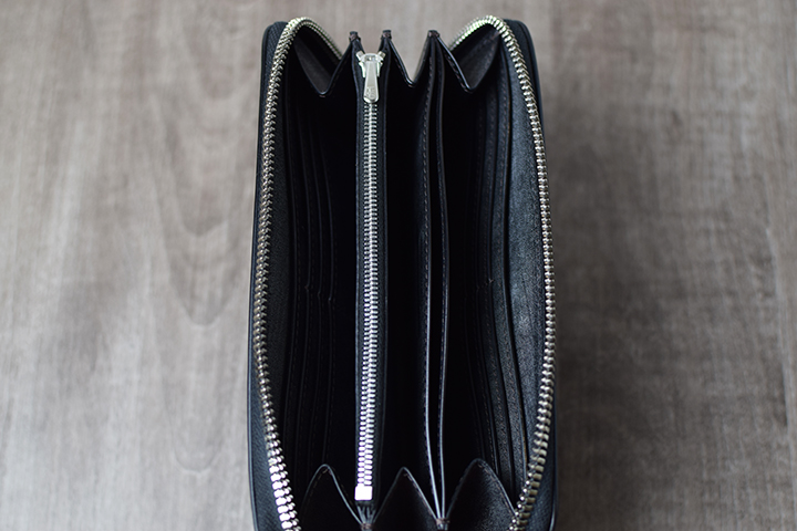 内装の中央にはファスナーがついた大容量のコインケースを備えています。両サイドにマチがついた構造によりコインケースの底までクリアに見ることができます。またこちらのコインケースは、パーツの底の部分と本体をあえて接続させない仕様となっています。こちらの仕様により、別の収納スペースにアクセスする際も可動域が広くなるため、中に収納したアイテムが取り出しやすく工夫されています。