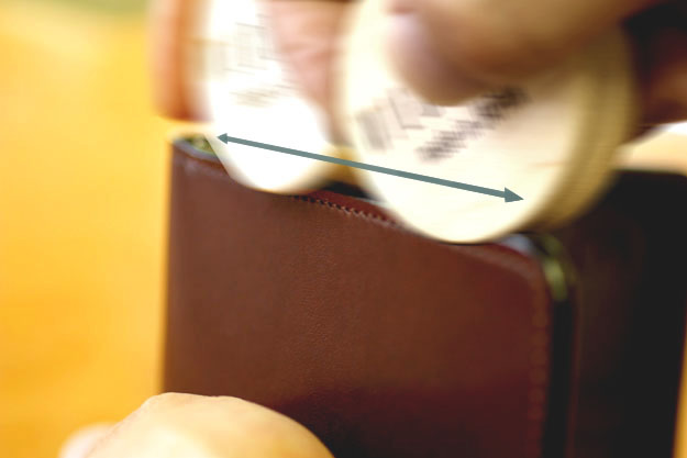 上の写真のように素早くスライドさせて、SLICKER側面の窪みを利用して磨きます。力の入れ具合ですが、凹みや傷が深かったら圧力をかけるように強めに力を入れて、浅かったら程々の力の入れ具合で構いません。この時SLICKERはコバに対して垂直に向けておきます。
