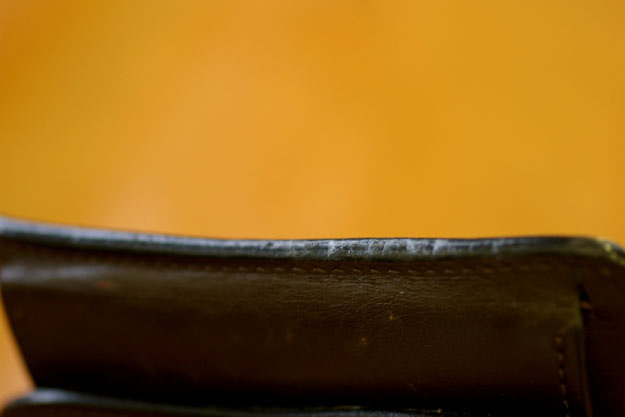 長く使っていると上の写真のような状態になりますが、SLICKERをかける際は、まずコバがひび割れていないか確認します。コバは1枚の革のように見えますが、革を何層にも重ね合わせて丸く面取りをしてありますので、お使い方次第で稀に層が剥がれ、コバが割れることがあります。