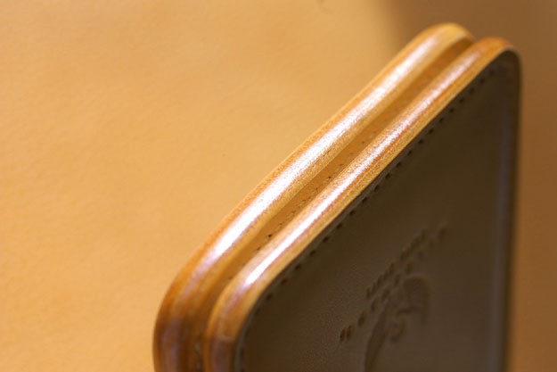 コバを乾拭きすると、色がナチュラルの製品のコバは木目のように美しく輝きます。殆ど木と言っても構わないくらいですが、ここから数年間使っていくと更に色艶の深みが増していき、本当に使い込んだ家具のような風合いに変わっていきます。