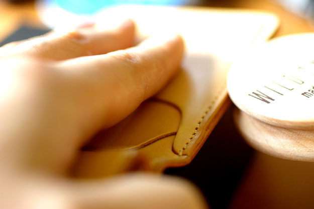 前回の補足になりますが、強めにSLICKERをかける場合は革小物本体が押しつぶされて、クニャっといくこともありますので、その場合は下に台を置いて水平にかけると良いです。