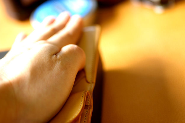 手の平で革小物を押さえて横からSLICKERを水平にかけます。やり方は前回と一緒です。