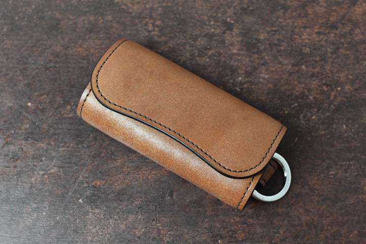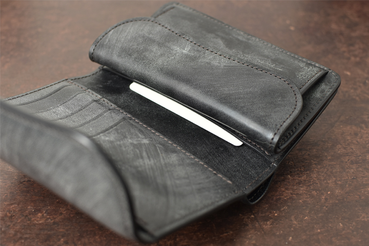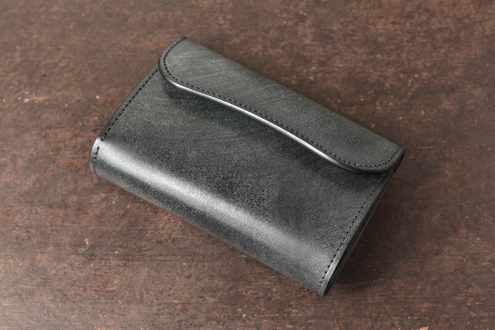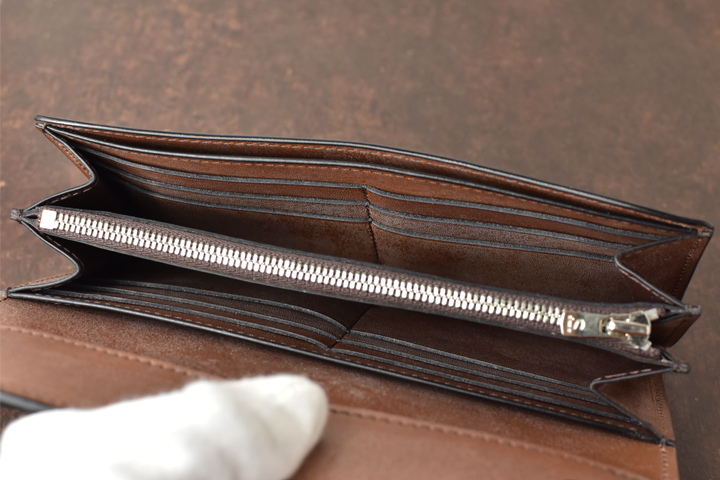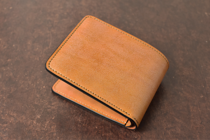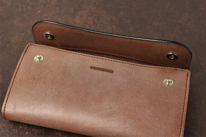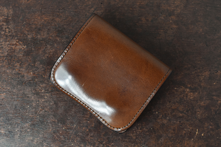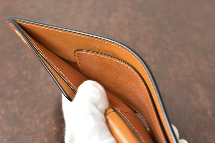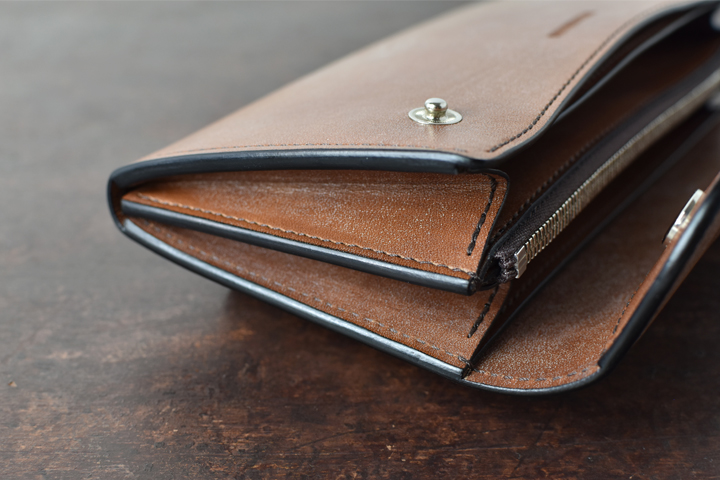 シンプルな外観がコバ(製品の縁、革の裁断面)の存在感を際立たせ、時間をかけて磨かれたコバの美しさが見て取れます。