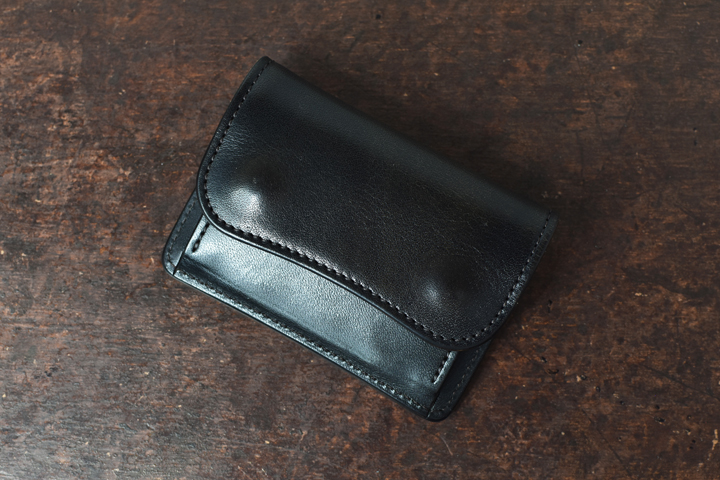最後は約1年使用したブラックの小銭入れ・フルグレインブライドルTONGUEです。上述したWAVEとPALMよりも短い使用期間となりますが、こちらもしっかりとブルームが落ち、ツヤが上がり始めています。表面に白く吹き出ていたブルームにより、灰色に見えていた色味はくっきりとした黒へと変化を遂げ、透明感のあるツヤがフルグレインブライドルレザーの持つ油分の潤沢さを物語っています。
