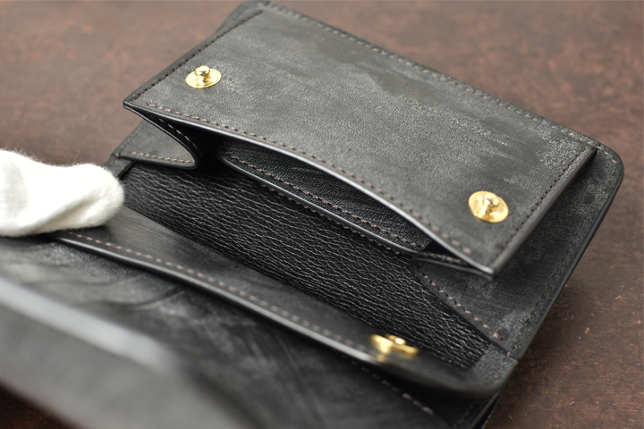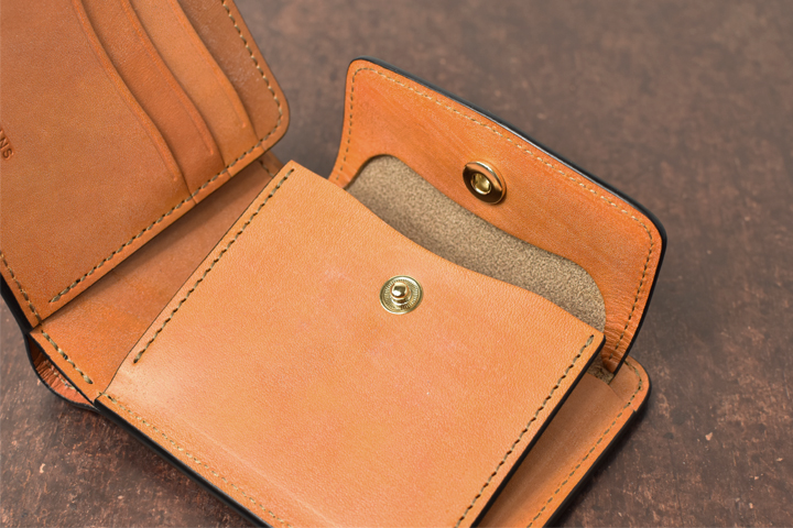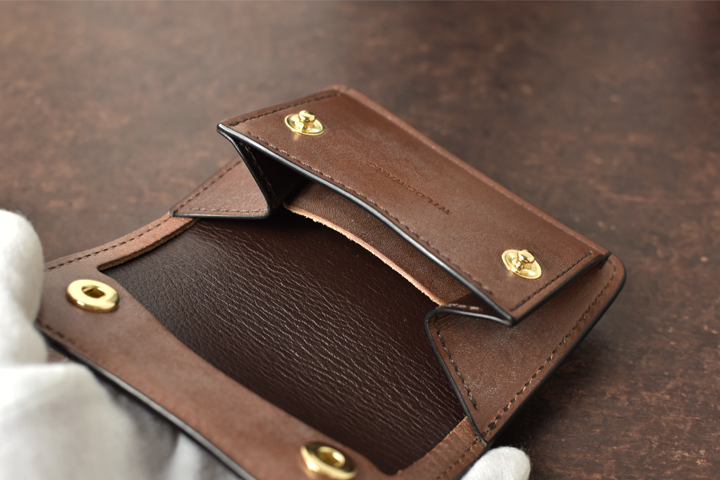 小銭入れは1点のバネホックがついたフラップで閉じられ、こちらは仕切りの無いシンプル構造となっています。