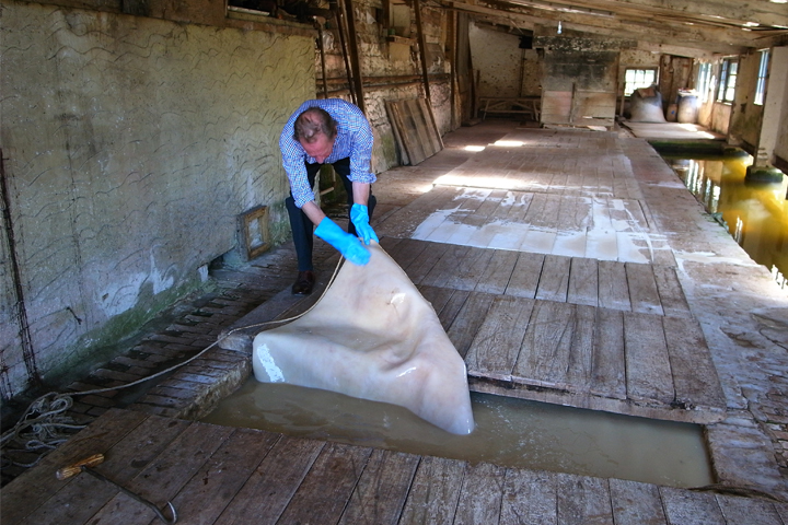 ベイカー社では古くからイギリスで用いられている、オークの樹皮から抽出したタンニンで皮を鞣す方法で製造を行っています。この工程のみで約1年という長い時間がかかりますが、この工程を踏むことにより一段と強度と耐久性が増した革へと仕上がります。