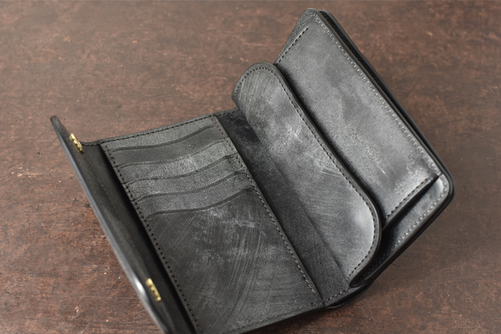 ぎっしりとした革の塊を感じる、収納力に優れた中型三つ折り財布です。