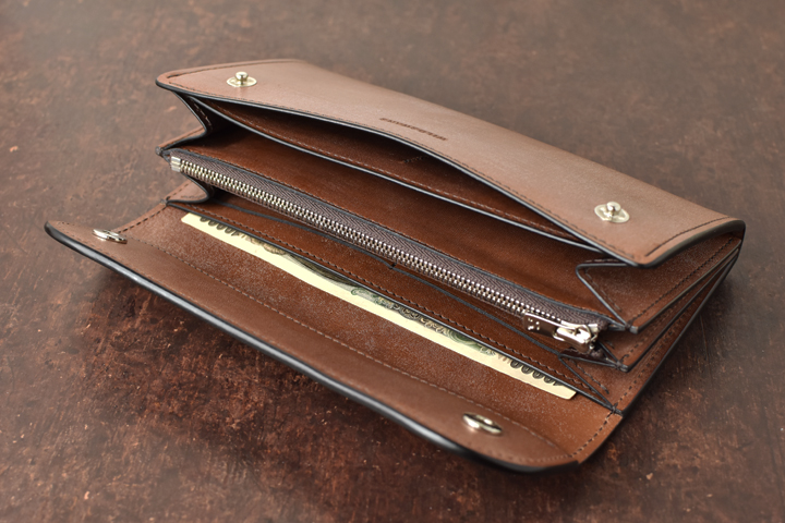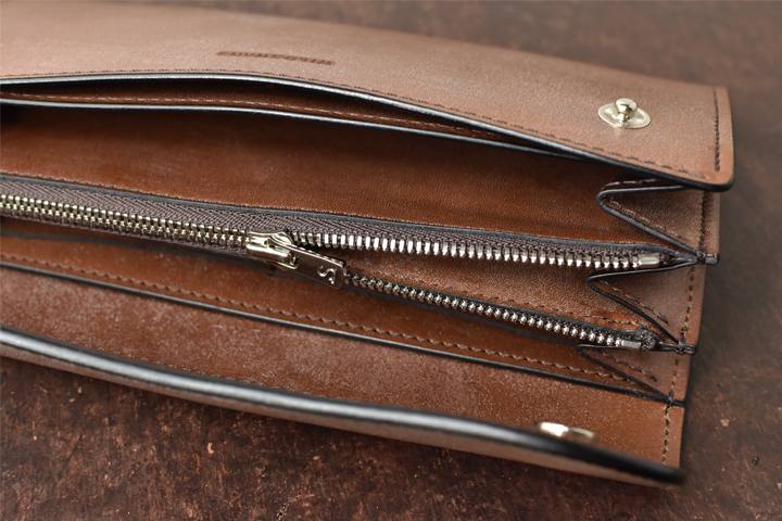 内装の中央に位置する小銭入れはWILDSWANSのロゴ入り入りのエクセラファスナーで閉じられており、エクセラファスナーを開くと片側のマチが大きく開くため、小銭を取り出す際に奥まで指が届くように設計されています。