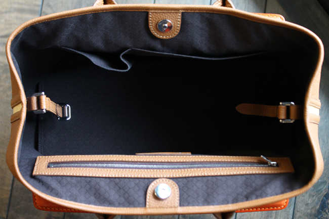 左右に設置されたベルトご覧が頂けますね。中に入れる荷物の容量によって調節が可能となっておりますので、美しいシルエットを保つのは勿論の事、バッグの余分な隙間を減らすという役割も果たしております。