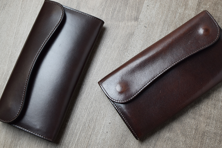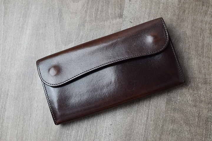 先ずは大型長財布・サドルプルアップWAVE(ウェイブ)/チョコです。使用は2年程ですが、艶が製品全体を覆っています。サドルプルアップはゆっくりとエイジングする皮革で、1~2年経過する頃からようやく明確な変化が現れます。