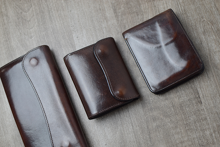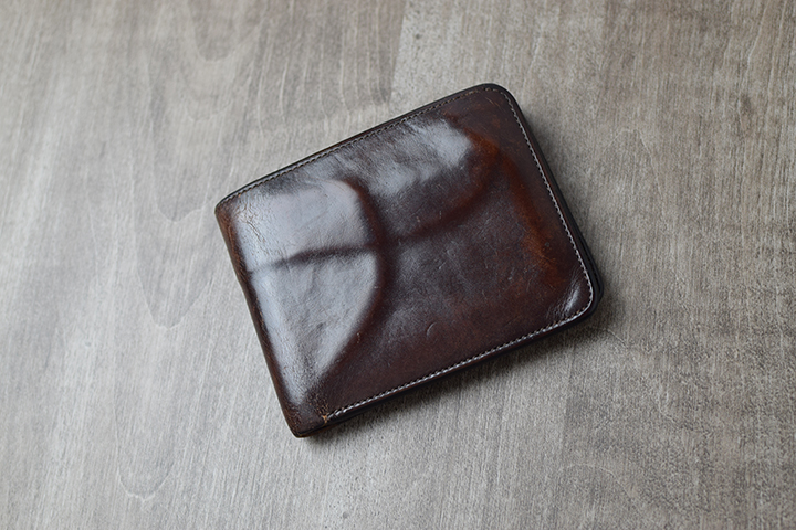 最後は王道の二つ折り財布・サドルプルアップGROUNDER(グラウンダー)/チョコです。こちらの使用期間は、なんと18年です。ここまでのエイジングになると圧巻の一言に尽きます。