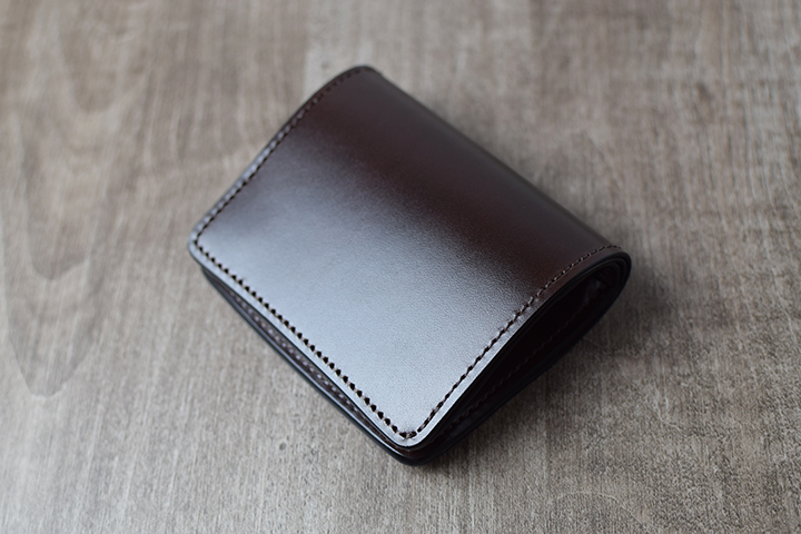 続いて何度かこちらのブログでもご紹介している小型三つ折り財布・サドルプルアップENO(イーノ)/チョコです。使用期間は約3年です。艶もしっかり出ており、ホックのアタリも含めていい雰囲気が漂います。