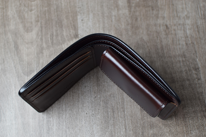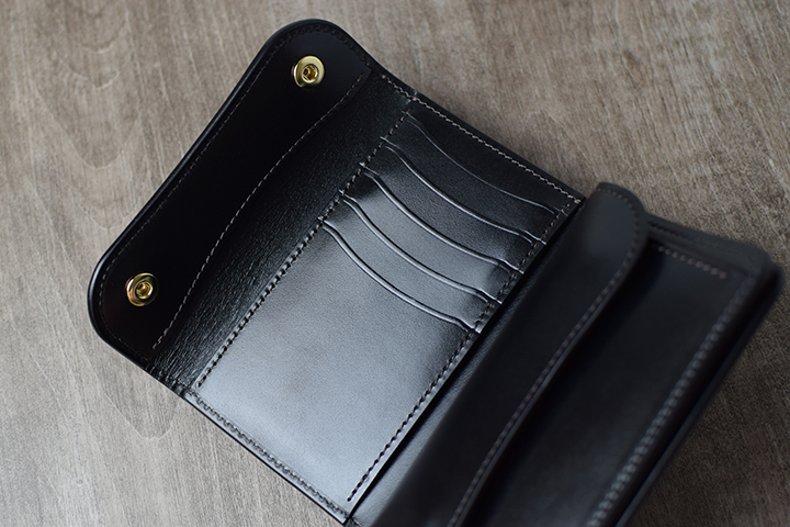 内装を開くと、左にカード段、右にコインケースを備えています。札室は本体のサイドに設けております。カード段は外周をL字でなぞるように縫製をかけたあおりポケットにより、カード段に収まり切らないカードが複数枚収納できます。