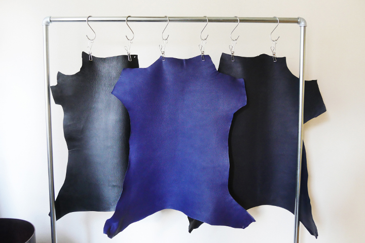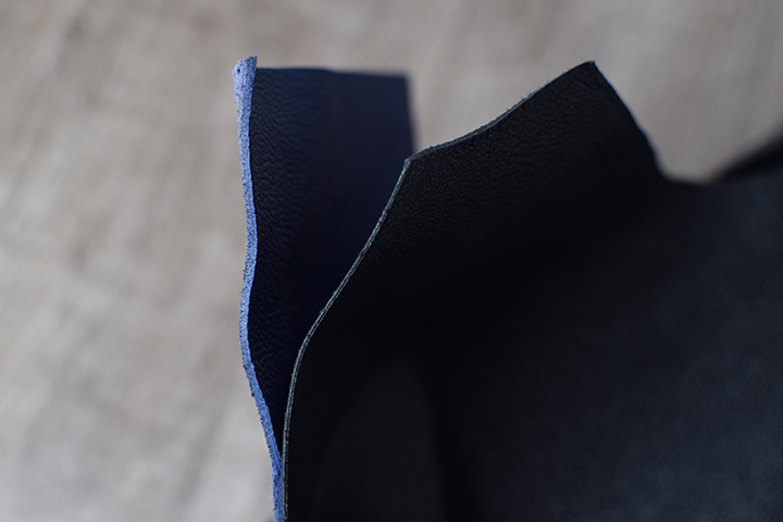 上の画像左が今回製作に用いられるブルーのジュリアンゴート、画像右がブラックのサフィアンゴートです。ジュリアンゴートは、サフィアンゴートの2倍程の厚みがありますが、ゴート全体で見ると、サフィアンゴートのような厚みが一般的です。この違いは視覚よりも質感でより実感することができます。一般的なゴートは、厚紙のようなペラペラとした質感なのに対し、メジスリー・ジュリアン社のゴートは、WILDSWANSが取り扱うサドルプルアップやイングリッシュブライドルなどの牛革にも匹敵するほどの厚みがあります。
