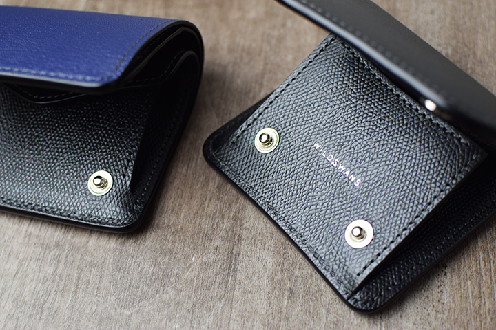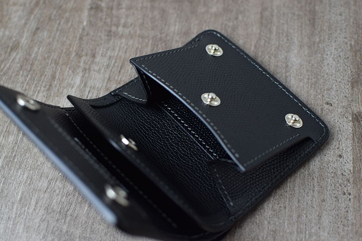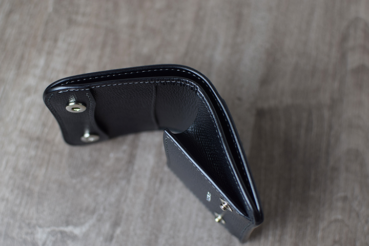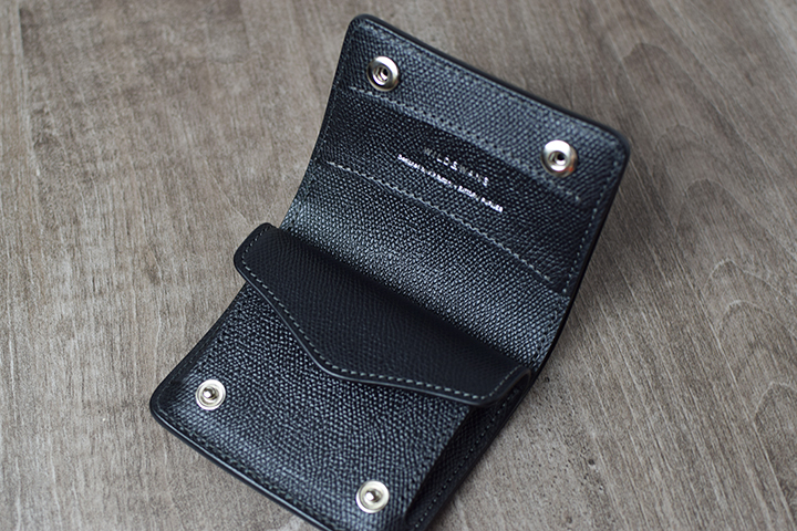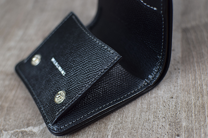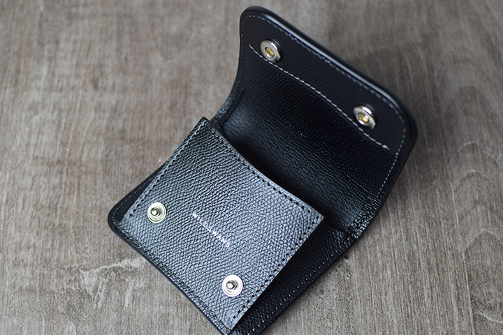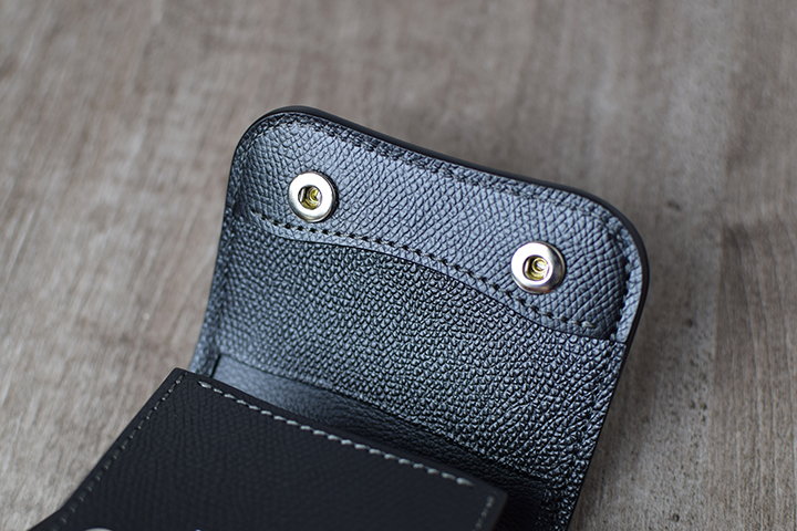 フラップを開くとPALMと同じように、下側の約半分がコインケースのスペースとなります。PALMと異なるのは、コインケースにホックが備わっていることで本体のフラップをどの向きで開いた際も、コインケース内に収納したコインなどが落下しない仕組みとなっている点です。またコインケース自体が下側に向けてシェイプされたスマートなデザインです。