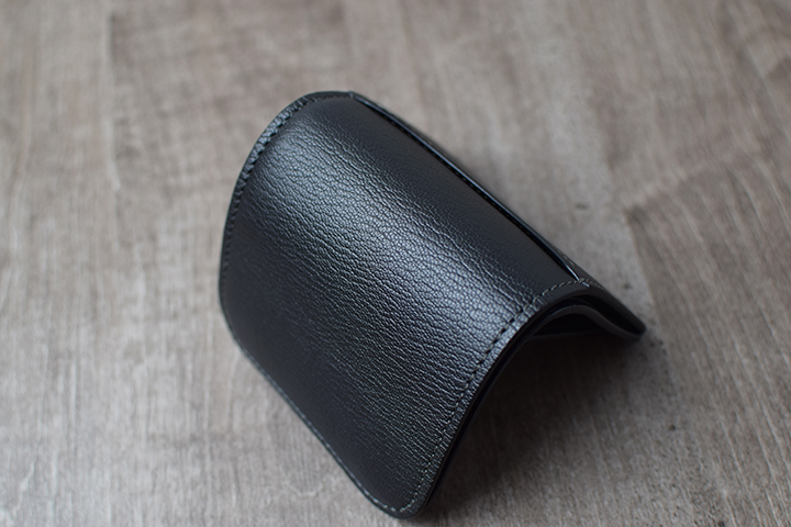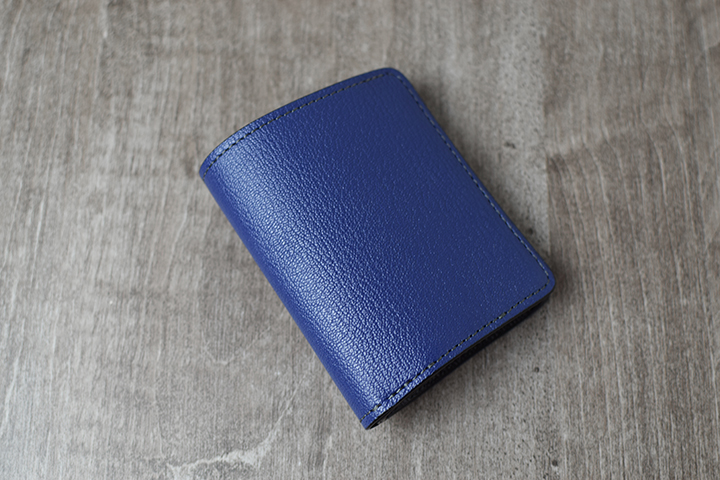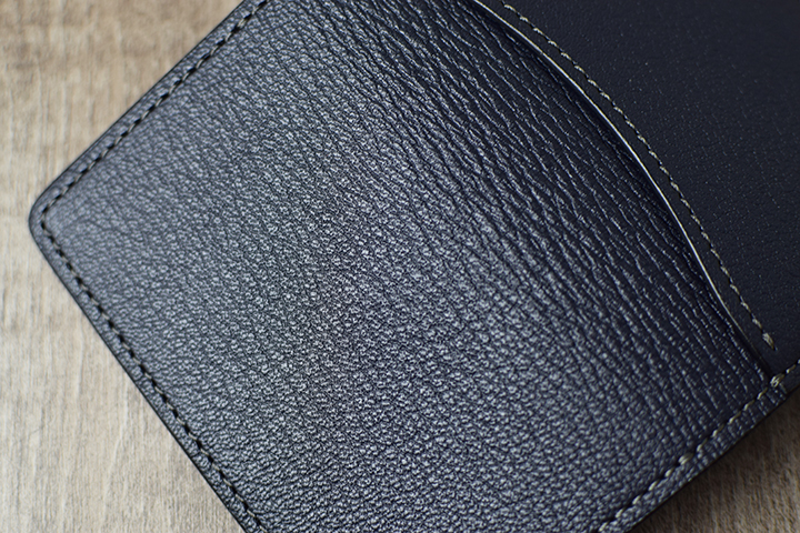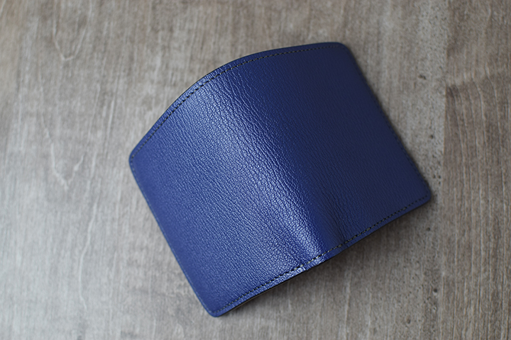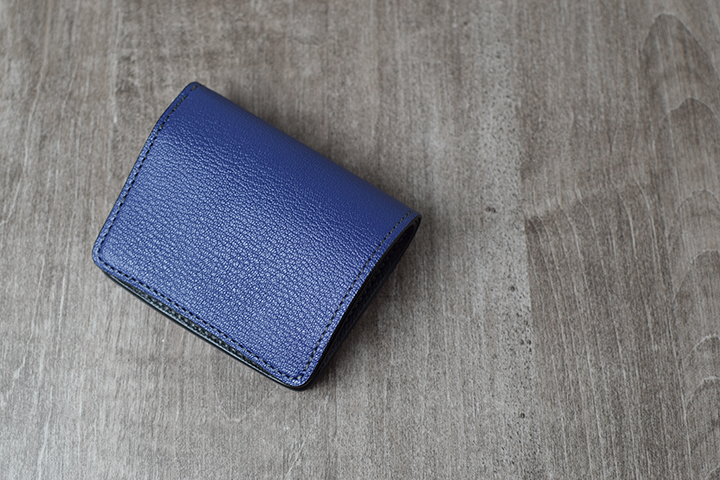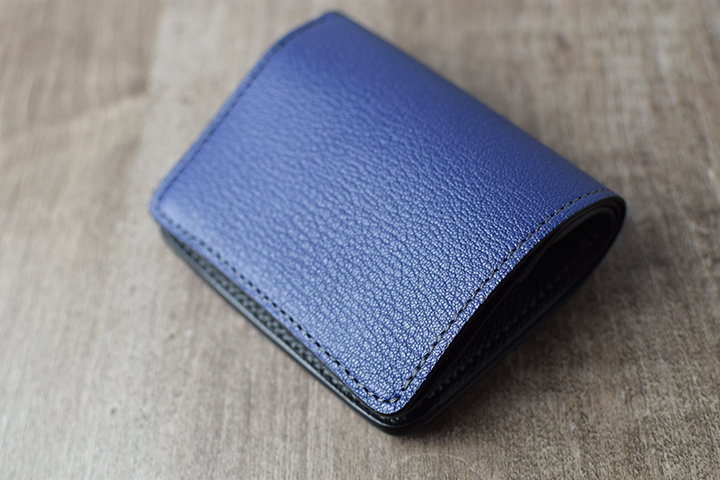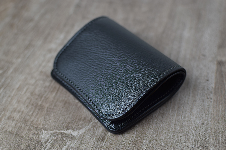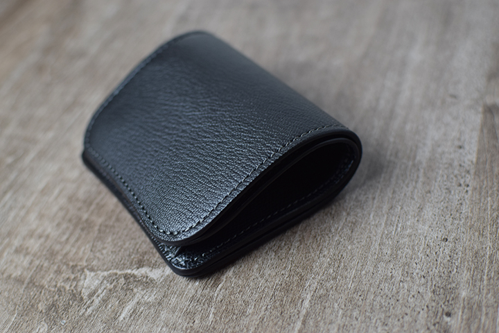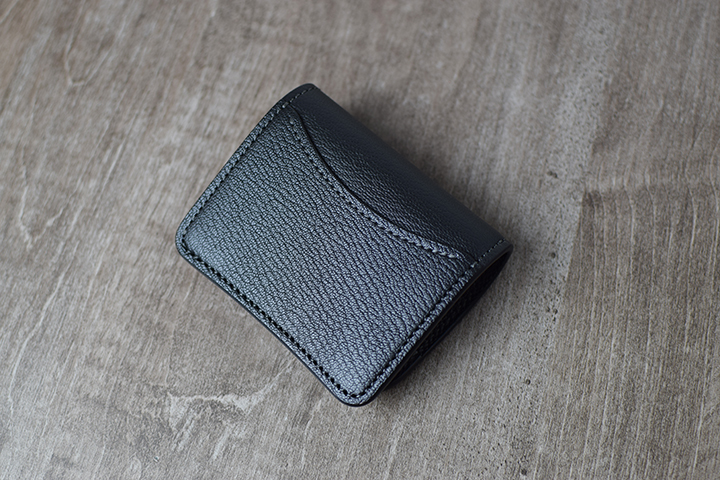 PALMと同じミニ財布に属するKF-003ですが、背面にはカードポケットなどの付属パーツが一切付かない、ミニマルで美しい外観が特徴です。フラップの中央部にある窪みがある面が、外装における表面となります。この部分は、上側のフラップが中央にかけて窪むのとは対照的に、下側にあたる部分は中央部分にかけてなだらかな山なりの形状でデザインされています。こうしたデザインにより、製品の表裏とフラップの開閉位置を直感的に判断することが可能となります。