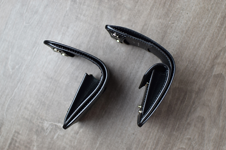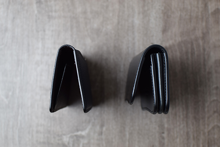 札室もPALMと同じく本体のサイドにあります。KF-003はPALMより少しだけ大きなアイテムとなるので、この分だけ一万円札の収納も比較的スムーズです。上の画像では側面から見たPALM(画像左)、KF-003(画像右)を並べて比較しています。