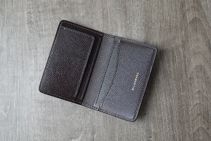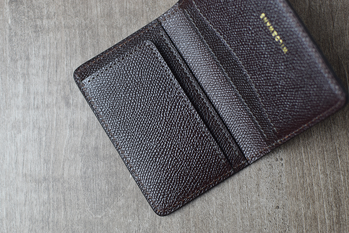 内装には4室の収納部を備えています。箔押しが光るポケットは中心部にかけて緩やかなカーブを描くデザインによりカードの出し入れがスムーズです。
