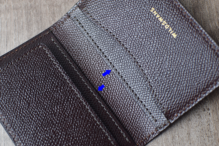右側のスペースにもカードを収納して頂けます。さらに一番外装に近い部分にはマチなしのカード収納ポケットがありますが、取り出し口が中央にかけて窪むデザインのため、取り出しやすさにも配慮されています。