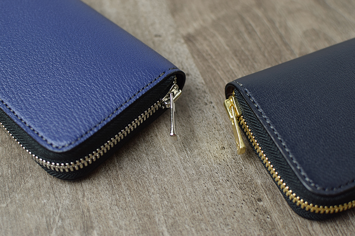 ネイビーのジュリアンゴートには、チョコを組み合わせることで、ユニークなツートンカラー仕様となります。こちらのカラーでは、ゴールドカラーの箔押しでブランドロゴが刻印されます。PALM、KF-003、LAFAROので使用するホックやファスナー等の金具は、箔押しと合わせてゴールドカラーです。