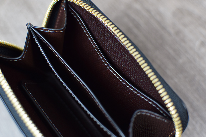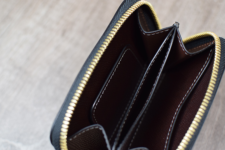 内装の半分のスペースはコインケースです。十分な容量を備えていることに加えて、両サイドにマチを設けているため、中に収納したアイテムが取り出しやすい仕様です。また、コインケース内部には「ベロパーツ」と呼ばれる革の仕切りがあり、仕切りの手前にコイン、仕切りの奥にカードが収納できます。