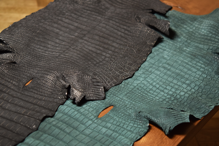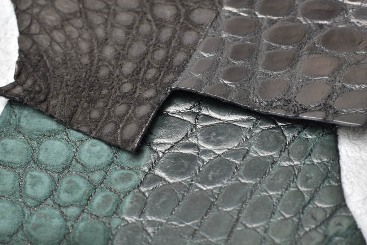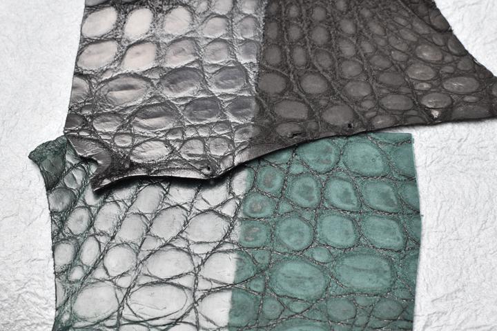 こちらは外装素材に使用されているヌバッククロコダイルで、カラーバリエーションはブラックとグリーンになります。 ブラック、グリーン系のナイルクロコにヌバック加工を施し、その後改めて染色を施した2度染めの皮革になります。