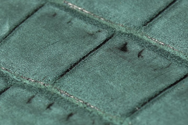 ヌバッククロコダイルの表面を近くで見ると分かりますが、部分的に細かく引っ掻いたような跡が見えます。これが起毛加工の跡になり、皮革の表面を薄くやすり掛けのように加工して表面の繊維を立たせていることで、ベルベットのような毛足のある表面になります。