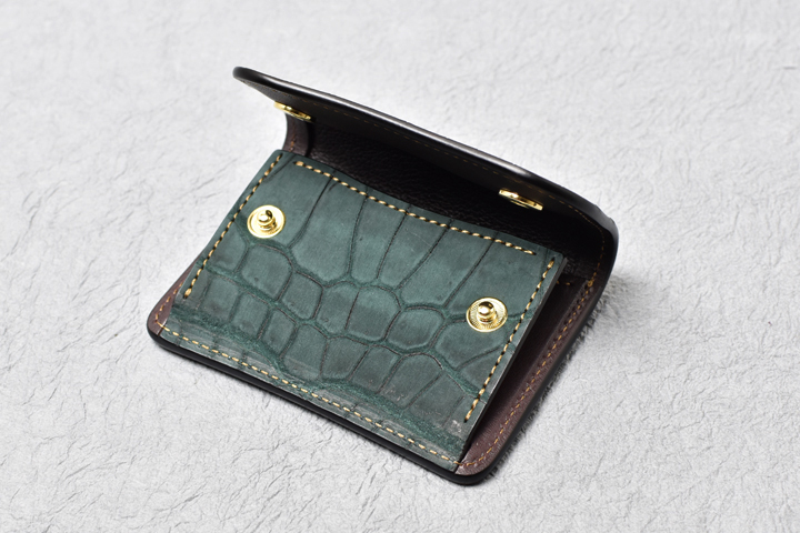 フラップ式のコインケースは内部に仕切りパーツを設けており、硬貨とカード類を分けて収納することが出来ます。