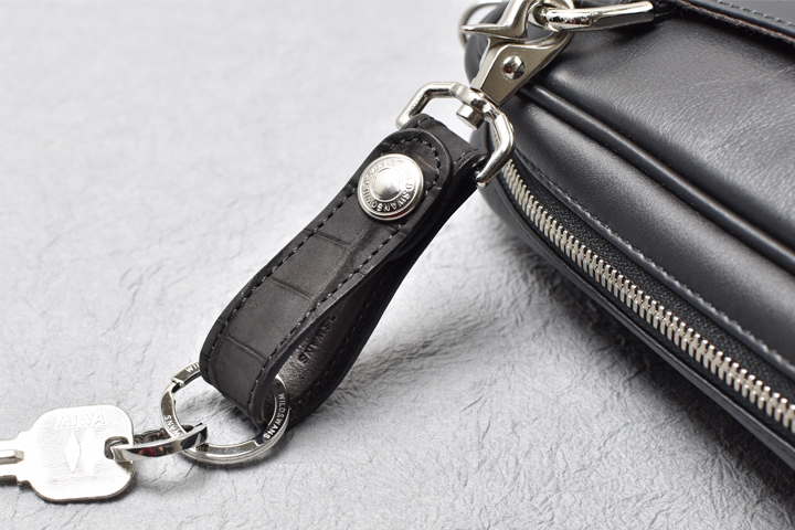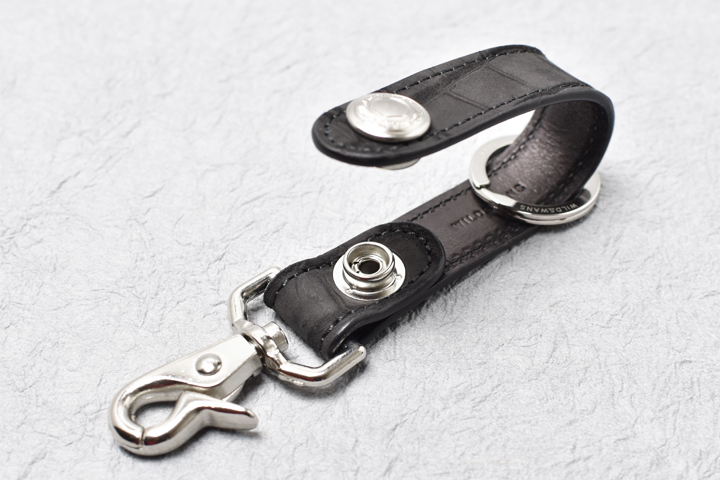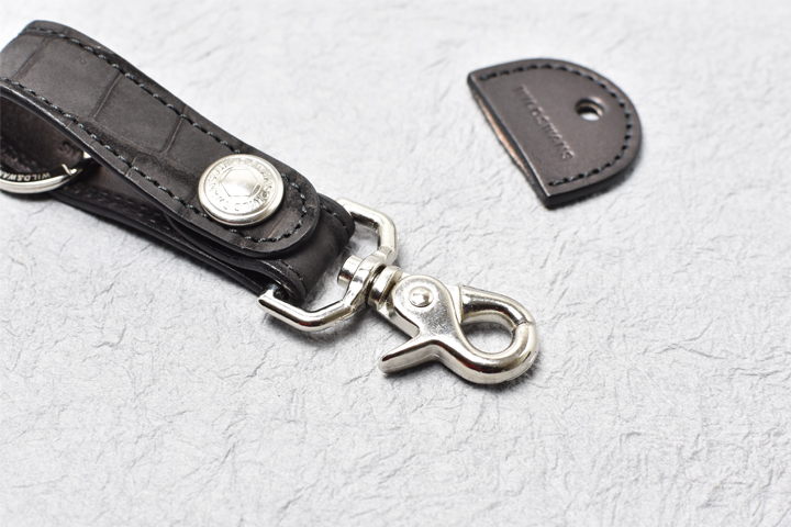 本体のホックは7050番と呼ばれる強力なホックを使用することでしっかりと固定が出来る、安心感のある仕様になっています。 このホックを外すと2重リングを取り外せますし、他のリングも取り付けが可能です。 本体のベルト部分はヌバッククロコダイルにイングリッシュブライドルレザーを貼り合わせて縫製されており、シンプルでも高い強度と耐久性を備えています。