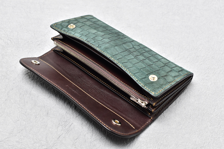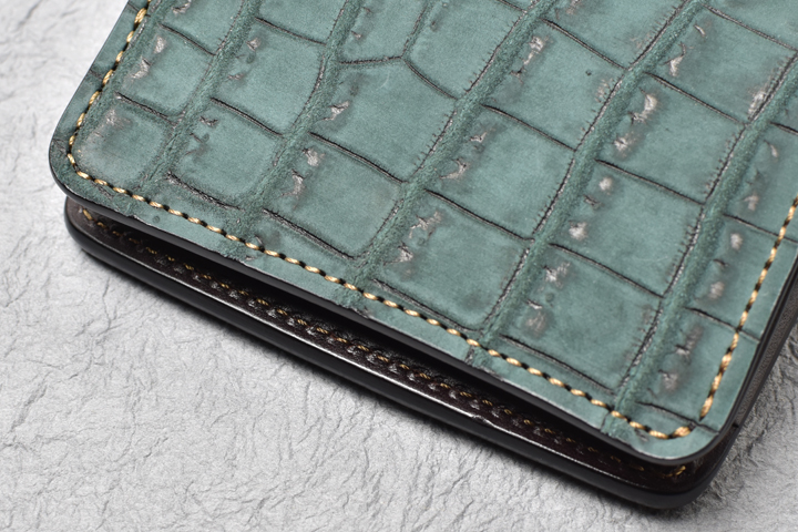 内装に使用したイングリッシュブライドルレザーはしなやかでありながらコシが抜けにくいという特徴を持った素材で、今回のヌバッククロコダイルとも相性の良い皮革です。 ブライドルレザーでありながらワックス成分を皮革内部に留める仕上げ工程を経ているため、一般的にイメージされるような表面のブルームは見られませんが、皮革全体にワックス成分を蓄えています。