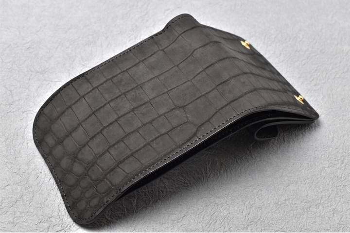 外装は切れ目の無い横長のパーツがぐるりと外周を一周しており、贅沢に大判のヌバッククロコダイルが使用されています。