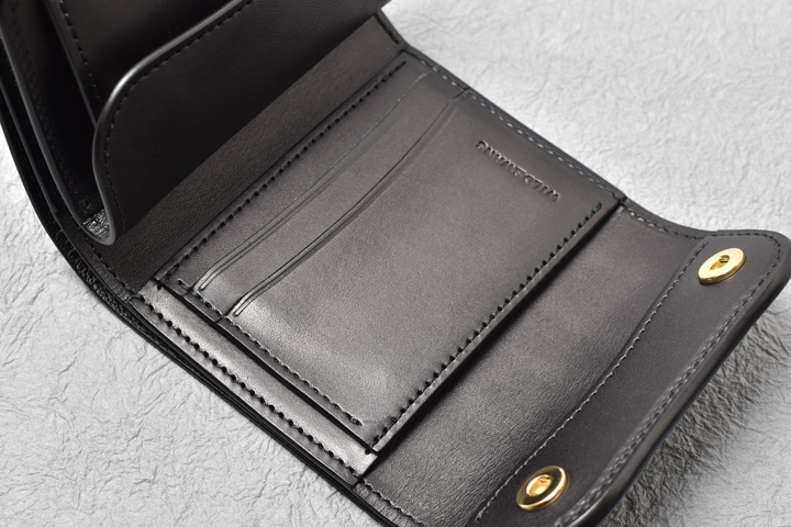 内装はカード段とコインケースが並びます。 限られたスペースに効果的に収納部を配置することによって、収納量を確保しています。
