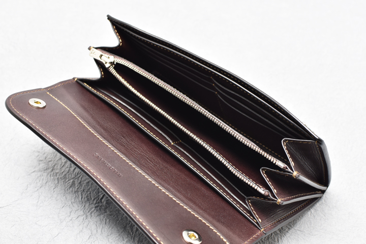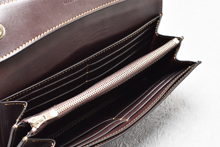 迫力の大型長財布・WAVEです。 大型のアイテムならではの皮革の迫力と余裕の収納量が魅力のモデルで、細かく機能的に配された収納部によって細かな仕分けにも対応が可能です。