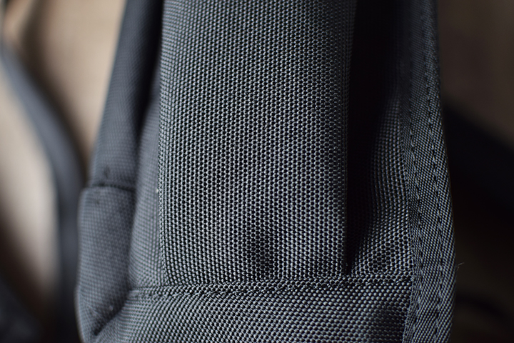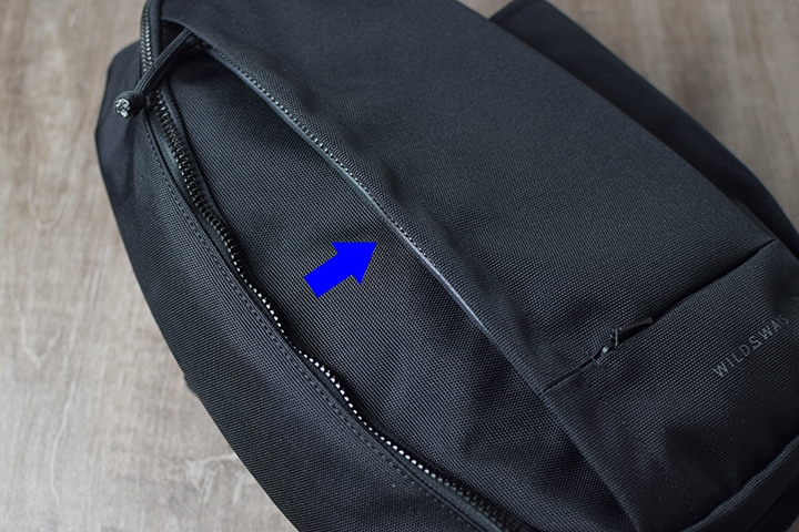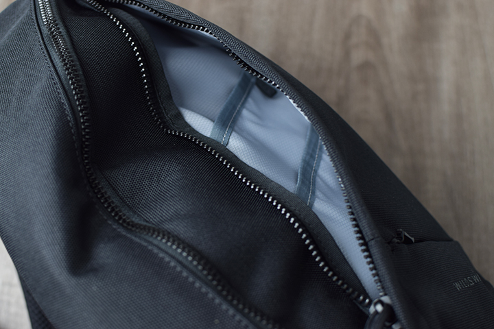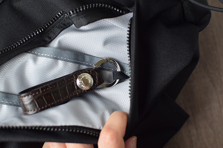 メイン収納部のファスナーはYKKのコイルファスナーを採用しています。程よい長さの引手が付くこちらのファスナーは驚くほど軽く、開閉もスムーズです。