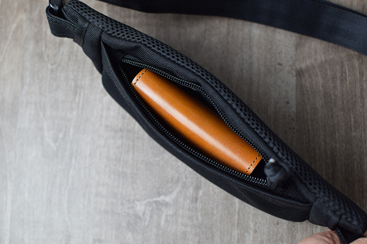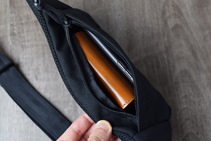 携帯性を重視しているバッグのため、メイン収納部の容量はそれほど大きいわけではありませんが、スマートフォンとミニ財布を同時に収納してもまだ少し余裕がありました。