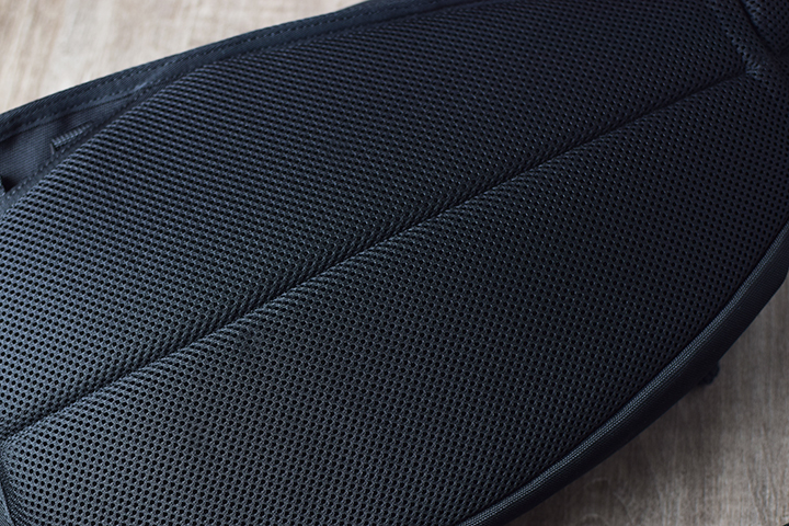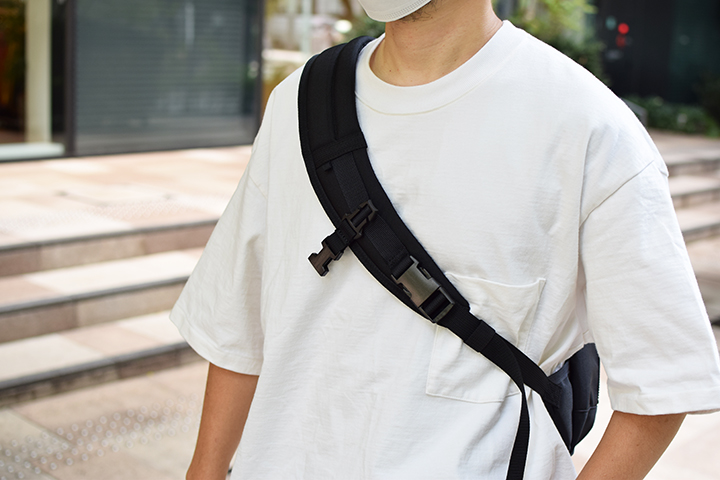 ショルダーストラップは一本のみとなりますが、最大幅が7㎝で十分なクッションが入っているため様々な動作に対応し、長時間身に着けても疲労を感じにくく工夫されています。