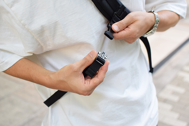 そして、こちらの細いストラップと太いストラップのバックルを接続させます。それぞれのストラップで長さの調整が可能ですので、様々なスタイルにフィットさせることが可能です。